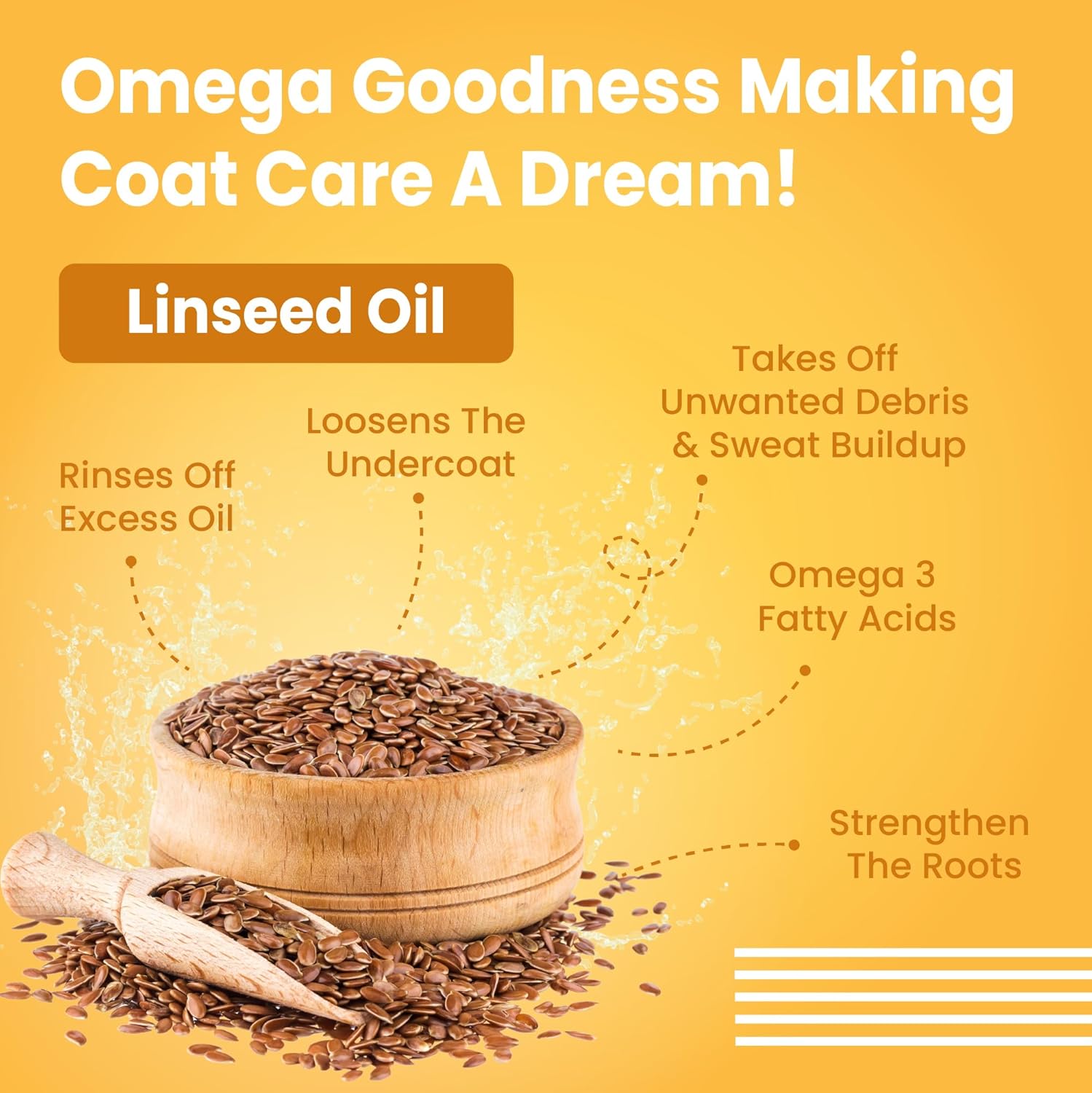 - OMEGA POWER: The anti-inflammatory characteristics of omega fatty acids aid in recovering the coat and control shedding. Linseed oil and evening primrose supplement the skin with omega fatty acids and moisture it to the optimum level. An organic protector that reduces itching, irritation, dander, and debris buildup.