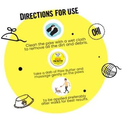 - DIRECTION FOR USE: Clean the paw with a wet cloth or clean water to remove all the dirt and debris, then apply a dab of paw butter with your fingers over paws, elbows, and nose especially in the areas where cracks and damages have occurred. Recommended for daily use, best used at bedtime.