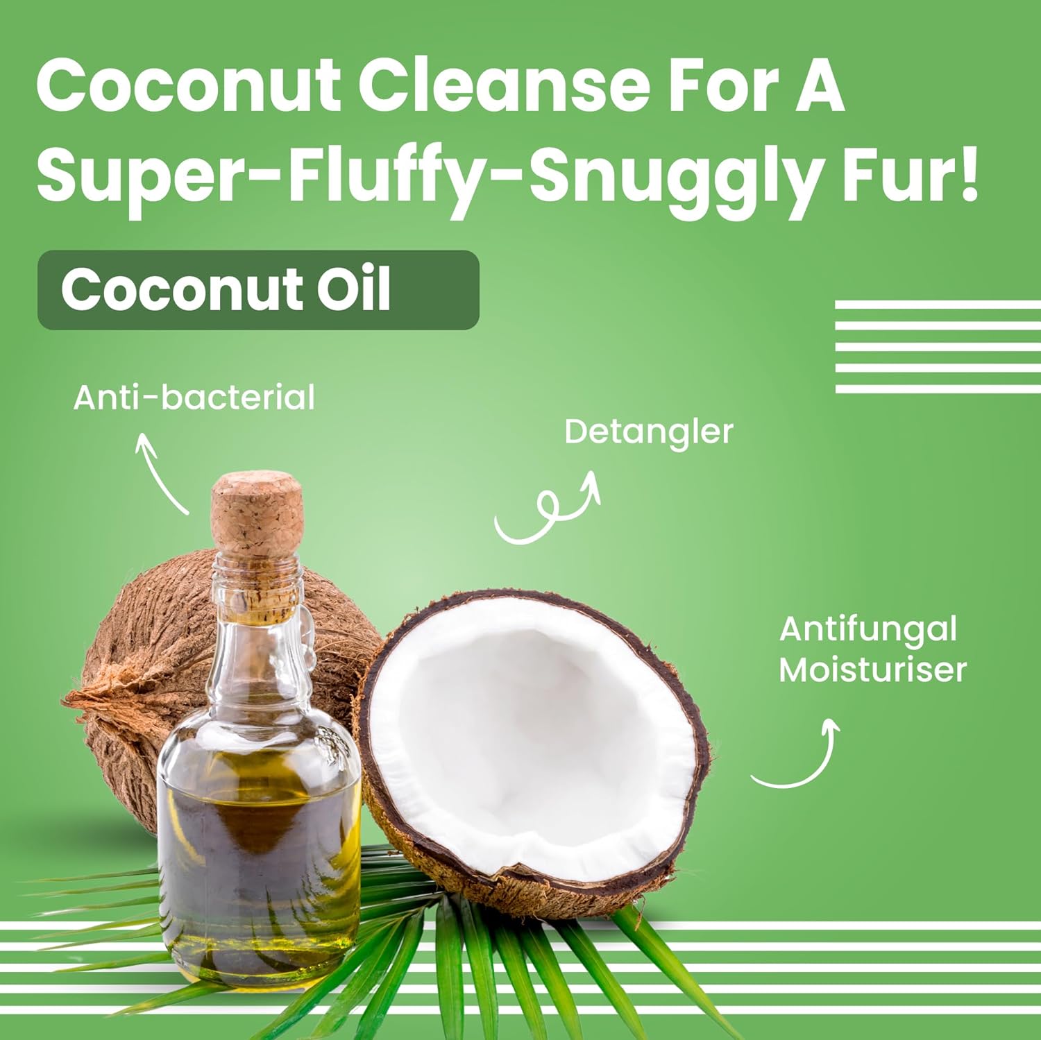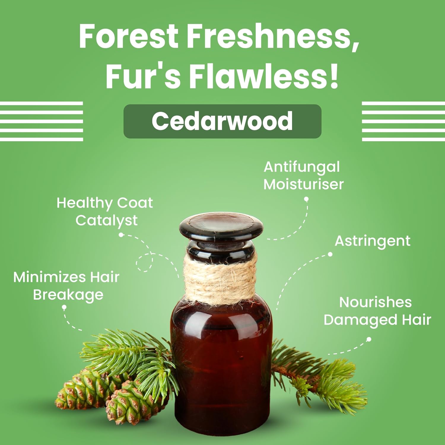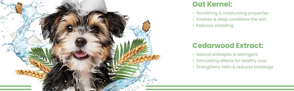 - oat management: Apart from a shiny coat, the coat is enriched with nutrients in every wash. Linseed oil reduces inflammation, flakiness and redness. Coconut oil has anti-bacterial and anti-fungal characteristics. Cedarwood extract works as a natural antiseptic and astringent. It strengthens the hair and reduces breakage.