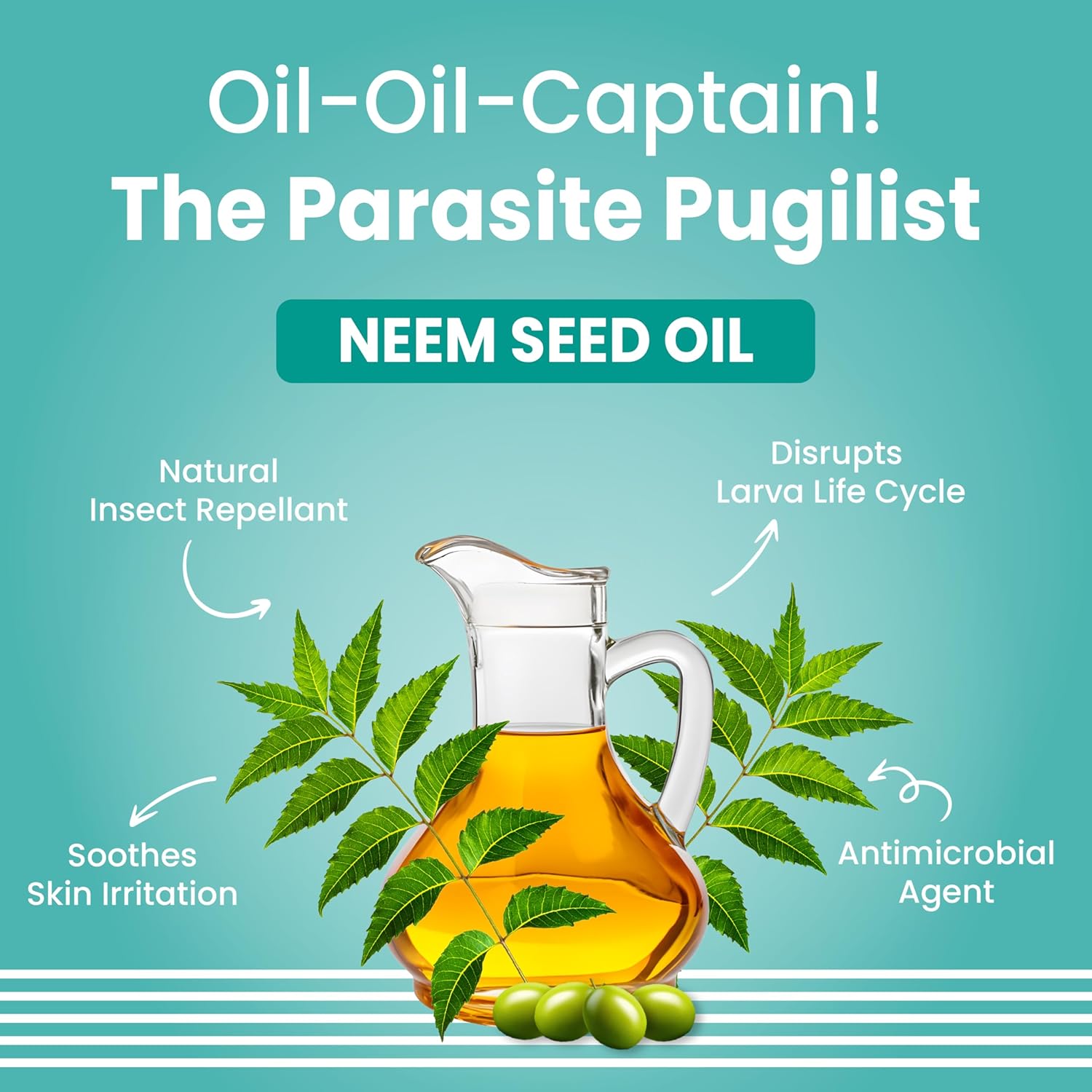 - Parasite-free: From breaking the growth cycle of larvae to killing them, the shampoo is effective in keeping them from growing. The larvicidal activity of Neem seed oil prevents pest infestations. Each wash eliminates and deters pests leaving the skin feeling nourished, moisturized, and itch-free.