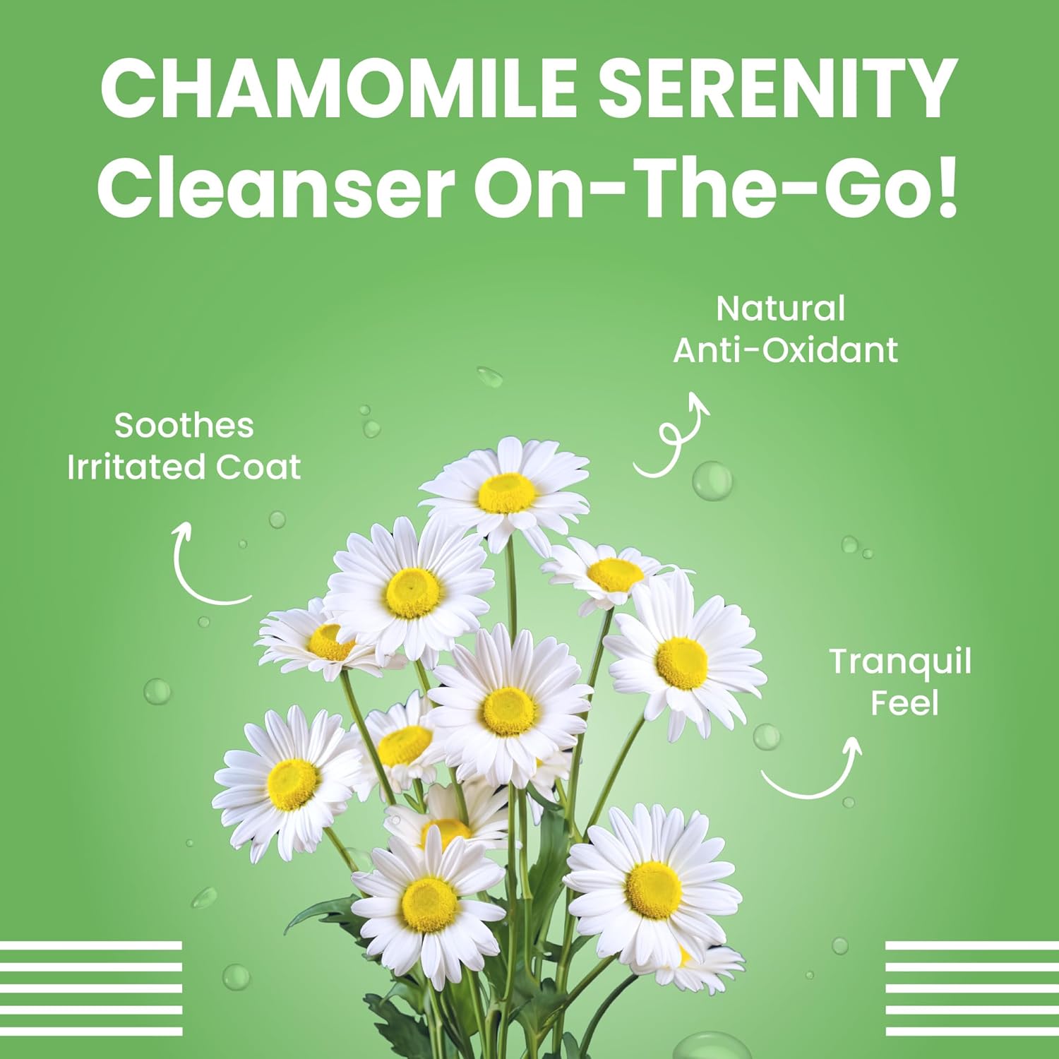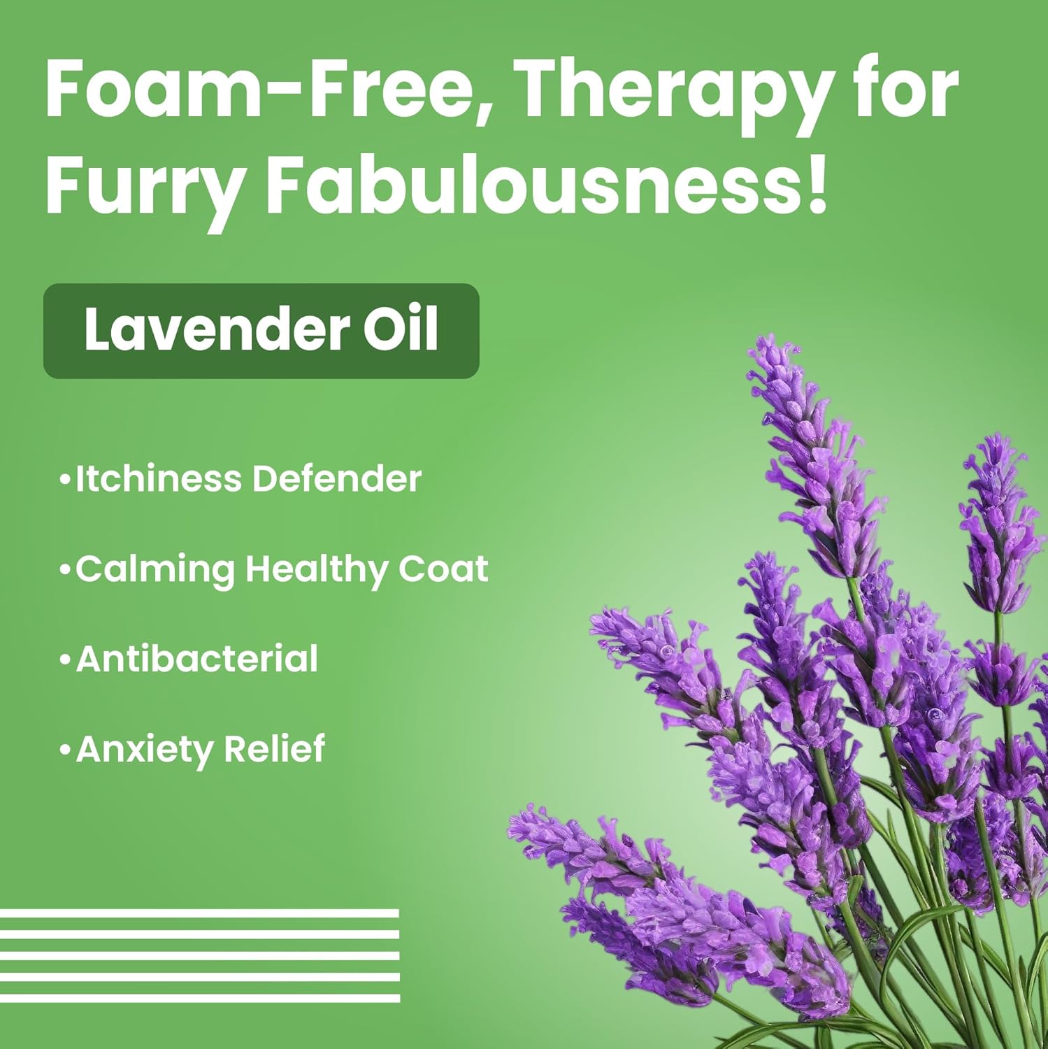 - Coat goodness: Lavender flower oil with its anti-bacterial characteristics protects the coat. Aloe vera works as a mild cleanser and chamomile oil is rich in antioxidants. Together, they care for the coat and make it healthier, stronger, and smoother!