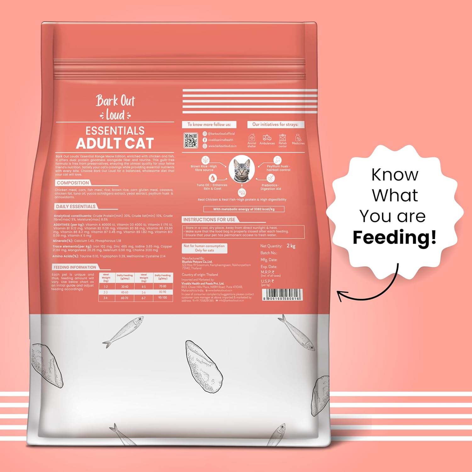 BARK OUT LOUD - Essentials Adult Dry Cat Food, Tailored Nutrition with Fish &Chicken, Kibbles Prebiotics, Hairball Control, Tuna Oil (2kg)