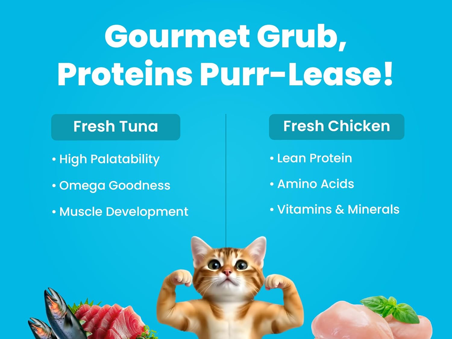 - PROTEIN MAESTRO: Composed of animal-based proteins, chicken, and tuna, our wet cat food is enriched with proteins. The Tuna helps in muscle development, enriched with omega fatty acids that help in lustrous, shiny fur. Chicken helps in weight management and in overall health development. Chicken helps in strengthening eye health.