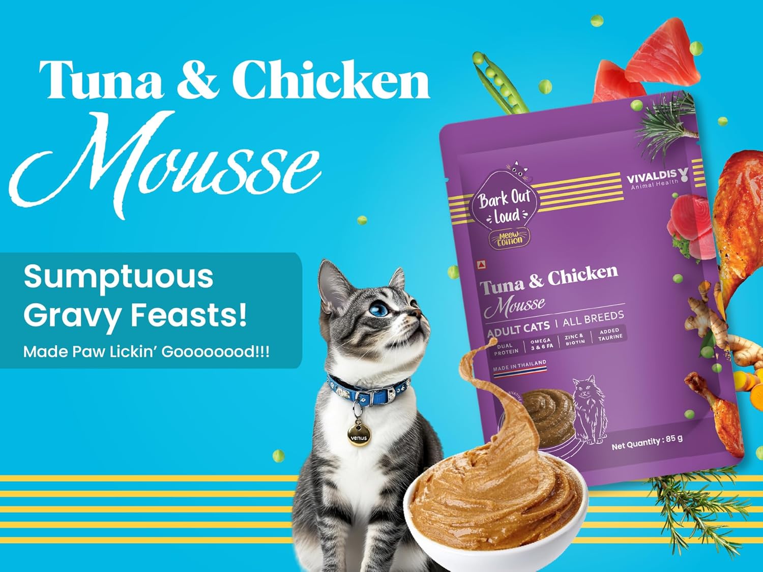 - NUTRITIOUS TASTE: The ultimate cat pleaser, the Bark out Loud Tuna and Chicken Mousse is the perfect bowl full of love, taste, and nutrition. Crafted in Thailand with ingredients, our wet food is a wholesome blend of dietary essentials such as meat, tuna serves an abundance of proteins, vitamins, and minerals, and the tuna and chicken mousse is a balanced hydrated blend of nutrients for adult cats.
